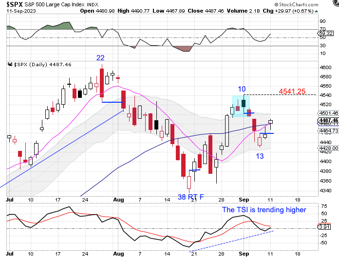 Stocks are currently in a daily uptrend. Since stocks formed a swing low above the lower daily cycle band on Friday, closing above both the 10 day MA and 50 day MA indicates a continuation of the daily uptrend and signals a cycle band buy signal. A break above the day 10 high of 4541.25 will shift the odds towards a right translated daily cycle formation.