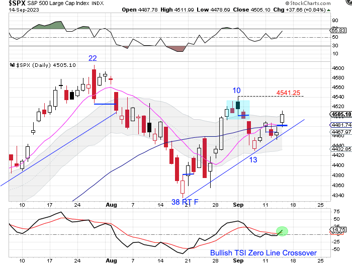 Stocks found support at the daily cycle trend line on Wednesday and formed swing low on Thursday, closing back above the converging 10 day MA and 50 day MA. Stocks are currently in a daily uptrend. Forming a swing low above the lower daily cycle band and closing back above the converging 10 day MA and 50 day MA indicates a continuation of the daily uptrend and signals a cycle band buy signal. A break above the day 10 high of 4541.25 will assure us of a right translated daily cycle formation.