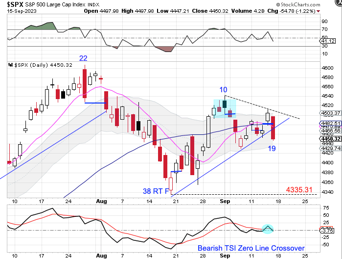 Stocks also closed below the daily cycle trend line on Friday to signal the daily cycle decline. Friday was only day 19. Stocks could trend lower for another 2 to 3 weeks before forming its DCL. The peak on day 10 locks in a left translated daily cycle formation. A break below the previous DCL of 4335.31 will form a failed daily cycle and extend the intermediate cycle decline. Stocks are currently in a daily uptrend. But a close below the lower daily cycle band will end the daily uptrend and begin a daily downtrend.