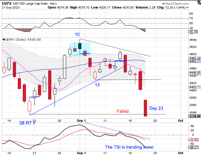 Stocks broke below the previous daily cycle low on Thursday. Breaking below the previous DCL forms a failed daily cycle and extends the intermediate cycle decline. Breaking below the previous DCL can also trigger a bloodbath phase, which could last 5 to 7 days. And 5 – 7 days would place stocks in their timing band for a DCL.