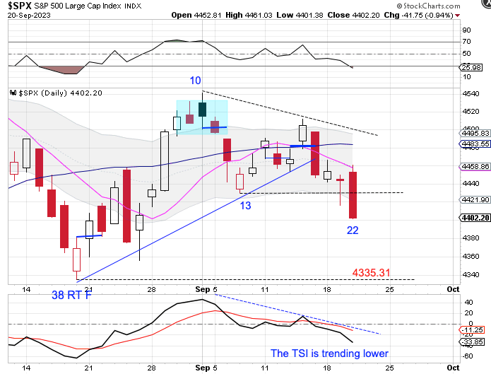 The peak on day 10 locks in a left translated daily cycle formation. Stocks closed below the converging 10 day MA and 50 day MA on Friday then delivered bearish follow through on Tuesday and Wednesday. Stocks closed below the lower daily cycle band on Wednesday. Closing below the lower daily cycle band ends the daily uptrend and begins a daily downtrend. Closing below the lower. daily cycle band also signals that stocks are extending their intermediate cycle decline. A break below the previous DCL of 4335.31 will form a failed daily cycle.