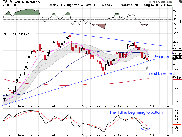 Tesla tested the trend line again on Wednesday — and it held. Tesla went on to form a daily swing low on Thursday. Stocks are currently in their timing band for both a daily cycle low and an intermediate cycle low, which I will cover in the Weekend Report. And stocks printed a bullish reversal on Thursday. So if this consolidation resolves as stocks print their pending DCL and ICL, this could send Tesla on a bullish trending move.