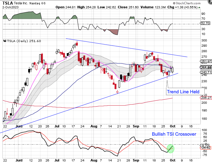 Tesla missing on Q3 deliveries is bad news for the company. And Tesla initially sold off on the news. However, Tesla managed to rally into the close. Tesla closed above the converging 10 day MA and 50 day MA, which is another check in the bullish column. A break above the upper stem of the triangle consolidation should result in a tending move.