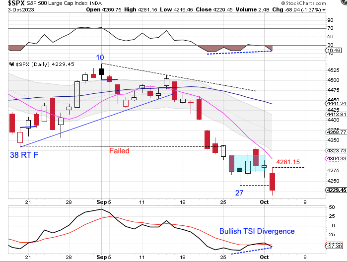 This bearish break out of consolidation could trigger a bloodbath phase that could last 5 to 7 days. However, Tuesday was day 31, placing stocks in their timing band for a daily cycle low. A swing low and close back above the 10 day MA will signal the new daily cycle. A break above 4281.18 will form a daily swing low.