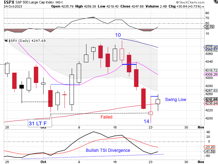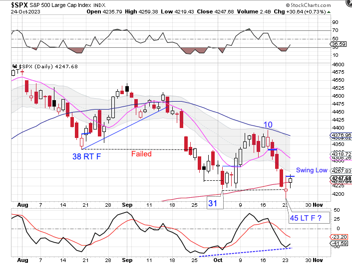 Forming a swing low and closing above the 200 day MA shifts the odds that Monday was the daily cycle low and the Tuesday was day 1 of the new daily cycle. A close above the 10 day MA will have us label day 45 as the DCL. Then a close above the 50 day MA will shift the odds that Tuesday was not only the DCL but the intermediate cycle low as well.