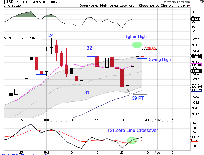 The dollar formed a swing low on Wednesday the printed a higher high on Thursday so we will label day 39 as the DCL.