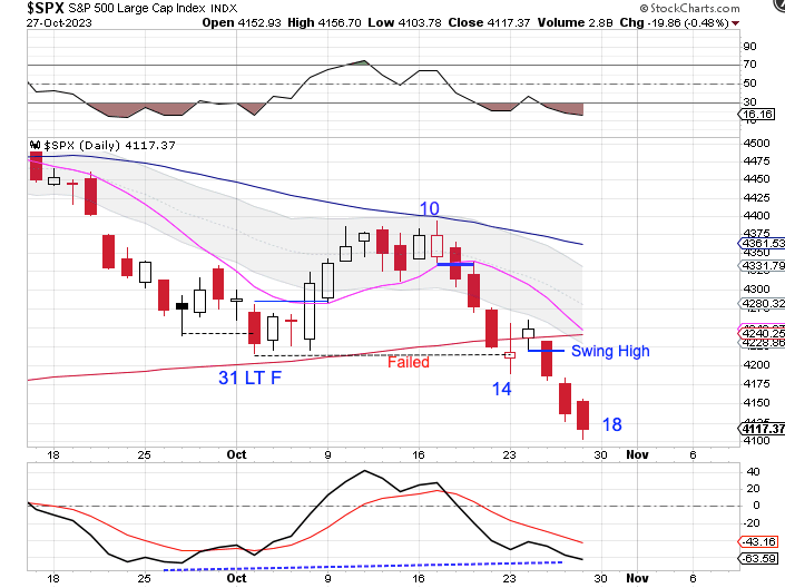 Wednesday’s swing high negated Tuesday’s swing low. Stocks went on to deliver bearish follow through into Friday. Friday was day 18 of a failed daily cycle. Stocks could trend lower for another 2 – 3 weeks to be in their timing band for a DCL. Stocks are currently in a daily downtrend. Stocks will remain in its daily downtrend unless they close back above the upper daily cycle band.