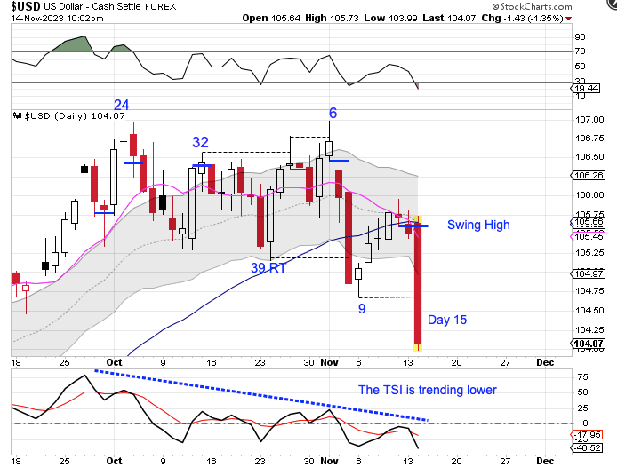 On Monday we discussed with the dollar in a daily downtrend, Monday’s swing high and close below the converging 10 day MA and 50 day MA indicates a continuation of its daily downtrend and signals a cycle band sell signal.