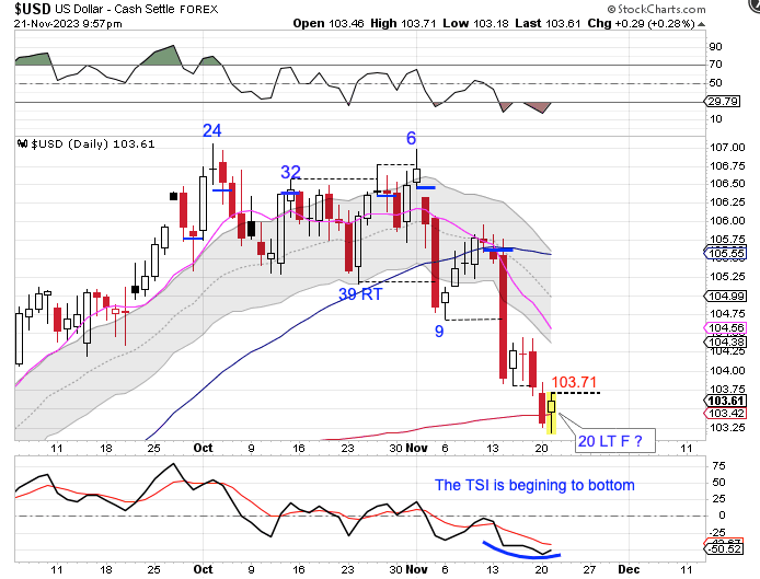 Tuesday was day 20, placing the dollar in the early part of its timing band for a DCL. The bullish reversal of support from he 200 day MA signals a new daily cycle. We will use a close above the 10 day MA to label day 20 as the DCL. The Dollar is currently in daily downtrend. The dollar will remain in its daily downtrend unless it closes above the upper daily cycle band.