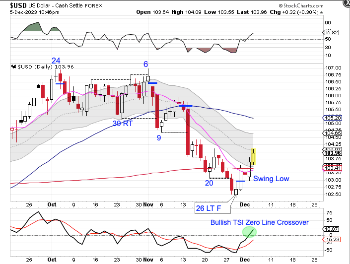 The dollar closed back above the converging 10 day MA and 200 day MA on Monday. The dollar delivered bullish follow through on Tuesday, turning the 10 day MA higher, to confirm that day 26 was the DCL. We will be watching the declining 50 day as the dollar rallies out of its DCL. How the dollar reacts to the declining 50 day MA will signal if the 3 year cycle low has been set or is it still out in front.