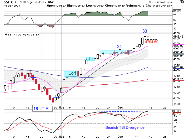 Thursday was day 33 for the daily cycle. That places stocks in its timing band for a daily cycle decline. Stocks are beginning to get stretched above the 10 day MA. We need to keep in mind that breakouts that occur late in the daily cycle are often not sustained. A swing high and close below the 10 day MA will signal the daily cycle decline. A break below 4704.69 will form a daily swing high. Stocks are currently in a daily uptrend. Stocks will remain in its daily uptrend unless they close below the lower daily cycle band.