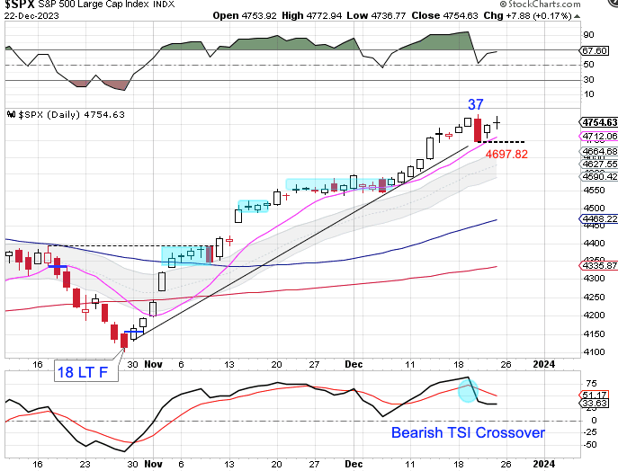 Wednesday was day 37 for the daily cycle. That places stocks in its timing band for a daily cycle decline. A break below 4697.82 will form a swing high. Then a close below the 10 day MA will signal the daily cycle decline. Stocks are currently in a daily uptrend. Stocks will remain in its daily uptrend unless they close below the lower daily cycle band.
