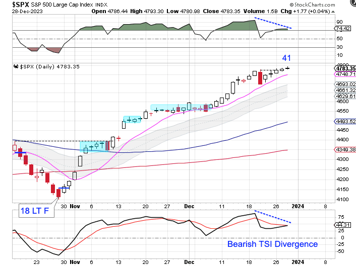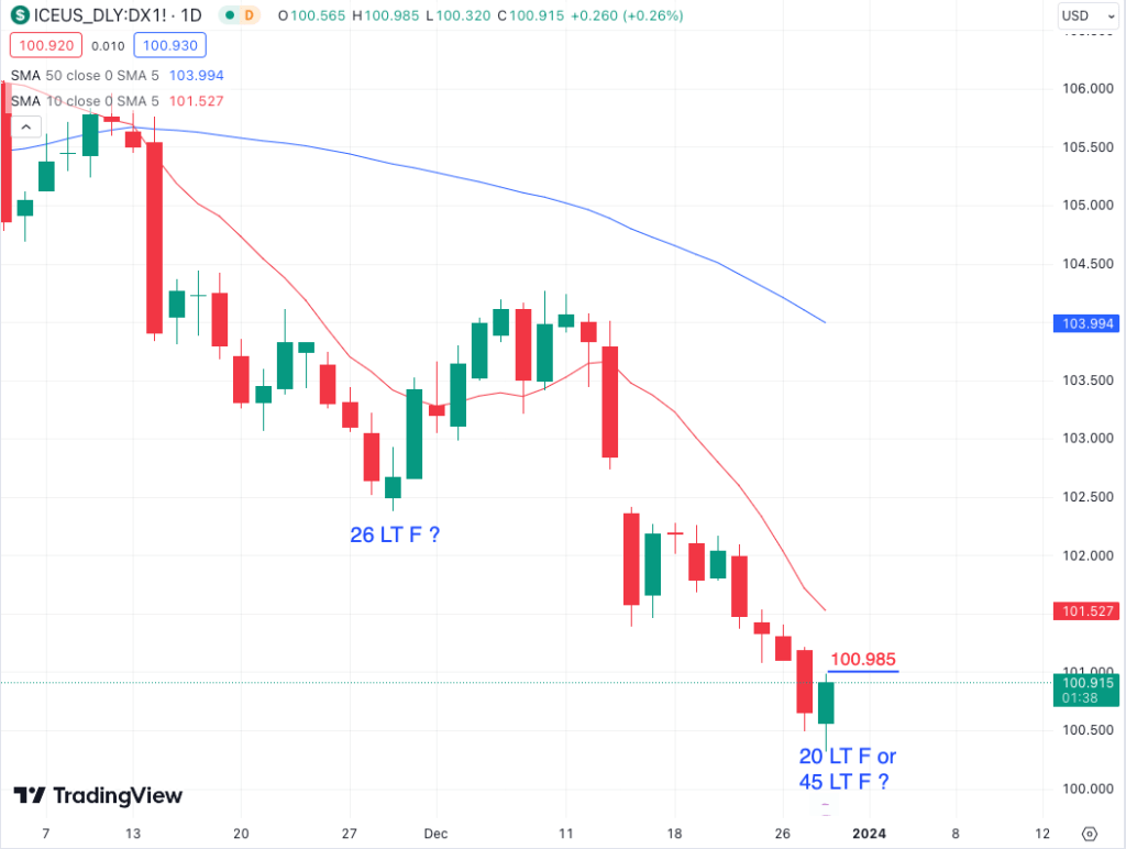 Thursday was day 41, placing stocks late in its timing band for a daily cycle low. A swing high and close below the 10 day MA will signal the daily cycle decline. And one thing that could send stocks into their daily decline is a rallying dollar.
