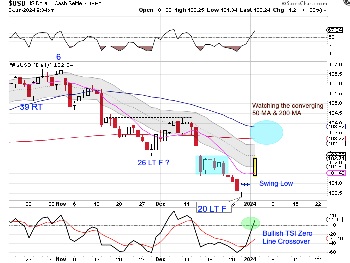 Another thing that could trigger the DCL is the dollar. The dollar rallying into a new daily cycle has helped to send stocks into their daily cycle decline. The dollar is approaching the converging 50 day MA and 200 day MA and we are getting a jobs report on Friday. A possible scenario could be the jobs number causes the dollar to be rejected here, which could then mark the DCL for stocks.