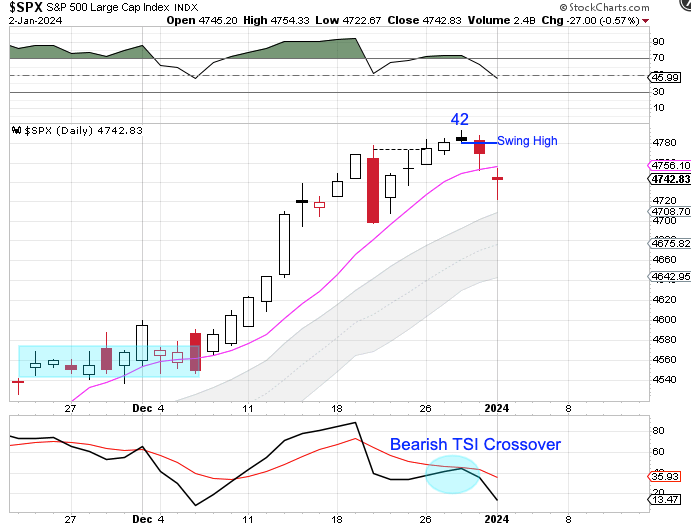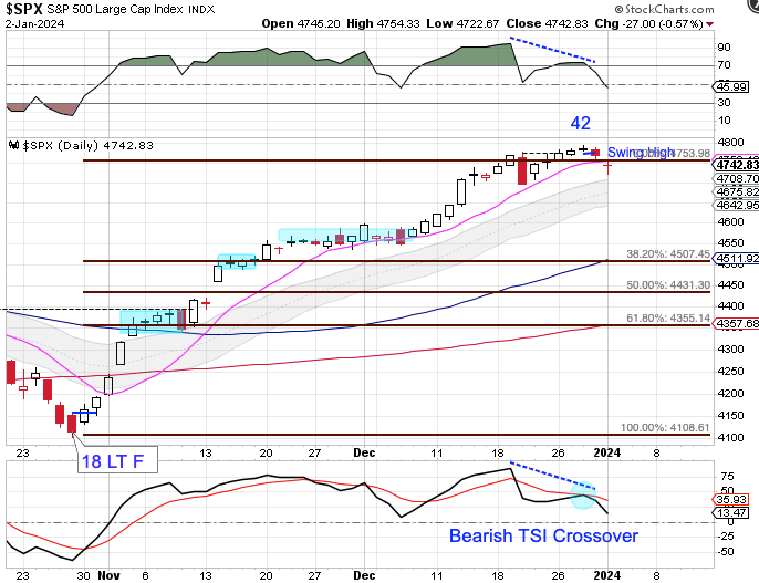 Stocks formed a swing high on Friday then closed below the 10 day MA on Monday to signal their daily cycle decline.