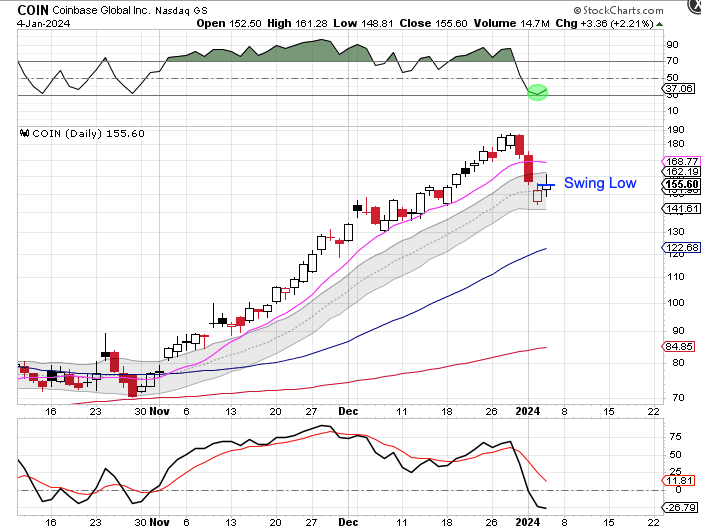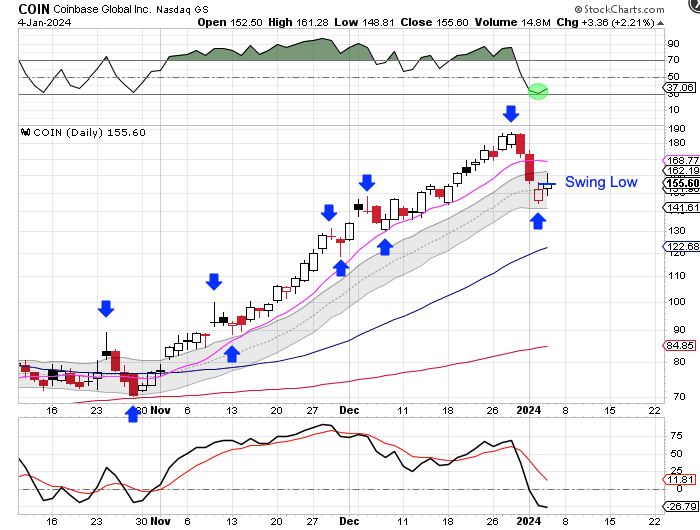 A daily uptrend is characterized by highs forming above the upper daily cycle band and lows forming above the lower daily cycle band. If COIN closes back above the 10 day MA that will indicate a continuation of the daily uptrend and signal a cycle band buy signal.