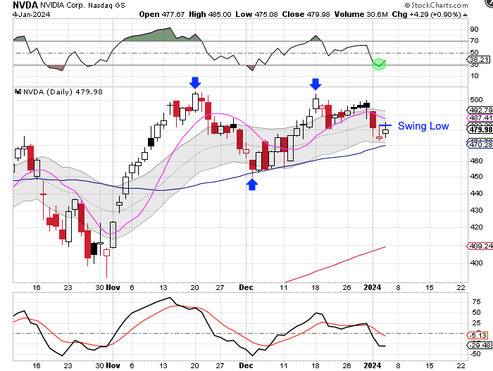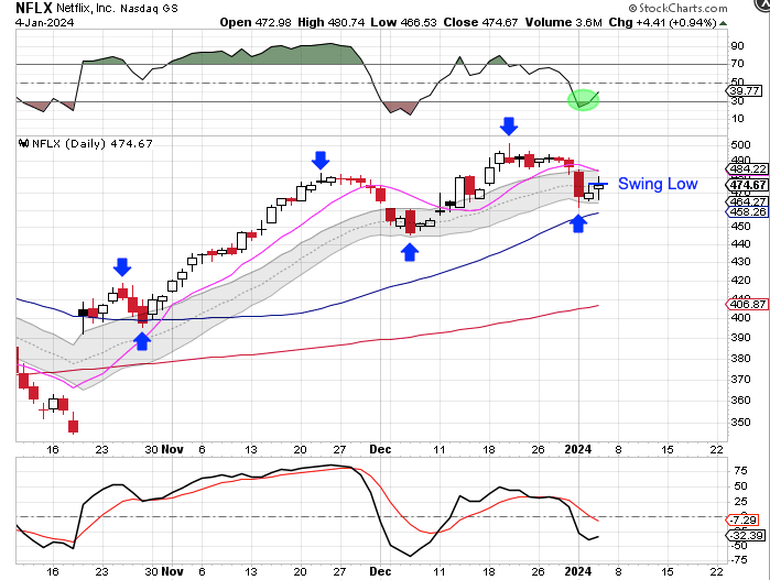 Both NFLX and NVDA are currently in a daily uptrend. Both formed a swing low on Thursday. Closing back above the 10 day MA that will indicate a continuation of the daily uptrend and signal a cycle band buy signal.