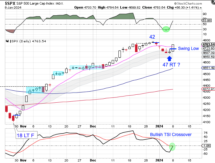 Stocks printed its lowest point on Friday, 47, placing them late in their timing band for a DCL to form. Monday’s swing low signals a new daily cycle. Stocks are currently in a daily uptrend. Forming a swing low and closing back above the 10 day MA indicates a continuation of the daily uptrend and signals a cycle band buy signal.