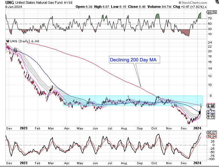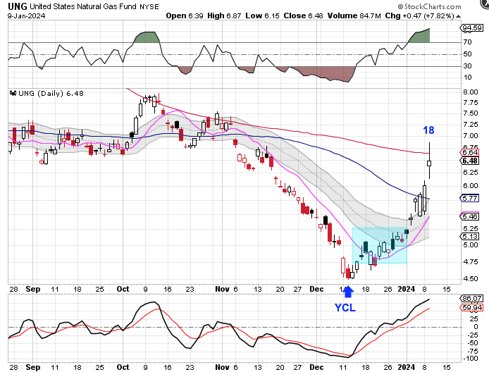 Natgas printed its yearly cycle low on December 12th. The drop into the YCL caused the 10 day MA to drop sharply. Natgas consolidated for the remainder of December, which allowed the 10 day MA a chance to bottom and begin to turn higher.