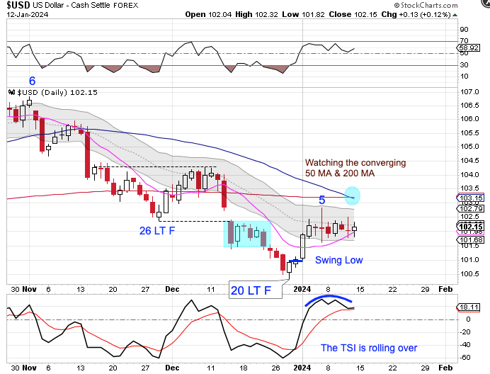 But close above the converging 50 day MA and 200 day MA would shift the odds that December 28th was both an ICL and the yearly cycle low for the dollar. Under this scenario the odds would shift to a left translated daily cycle formation for stocks.