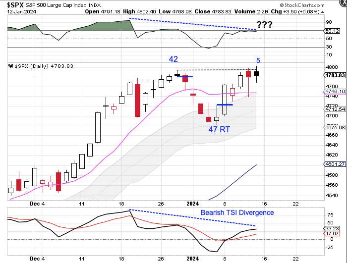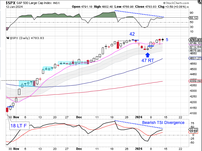 The decline into the day 47 DCL saw RSI 05 become oversold. That was quickly reversed, which aligns with being in the advancing phase of the intermediate cycle. The concern I have is that while stocks broke out above the previous daily cycle high, RSI 05 did not get overbought. This is something to watch going forward. A quick bearish reversal would be an early warning to a change in trend.