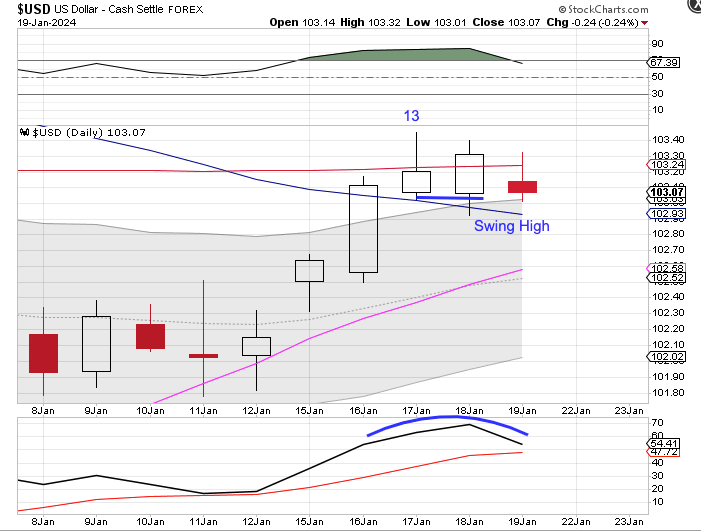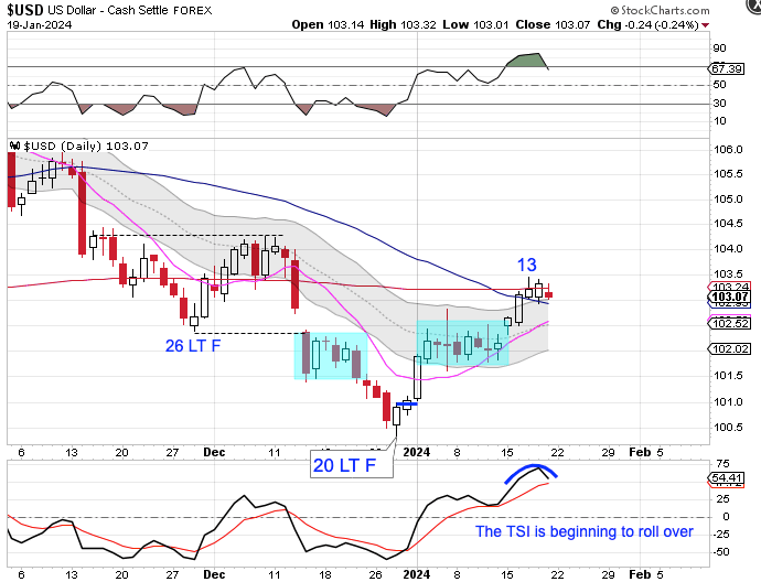 However the dollar formed a swing high on Thursday then lost the 200 day MA on Friday. A close below the 50 day MA would signal the daily cycle decline. The dollar is currently in a daily uptrend. The dollar will remain in its daily uptrend unless it closes below the lower daily cycle band.