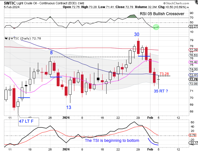 Oil printed its lowest point on Monday, day 35, placing it in its timing band for a daily cycle low. Monday’s bullish reversal eases the parameters for forming a daily swing low. A break above 73.28 will form a swing low. Then a close above the 50 day MA will signal the new daily cycle. Oil is currently in a daily uptrend. A close back above the 10 day MA that will indicate a continuation of its daily uptrend and signal a cycle band buy signal.