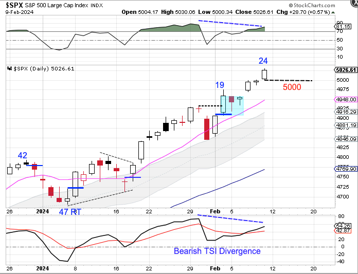 At 24 days, stocks are nearing their timing band for a daily cycle decline. With stocks being stretched above the 10 day MA, along with bearish divergences continuing to develop on the oscillators, stocks were at risk of the 5000 level triggering a take profit event. Now that stocks closed above 5000 stops can be raised to 5000.