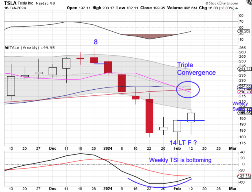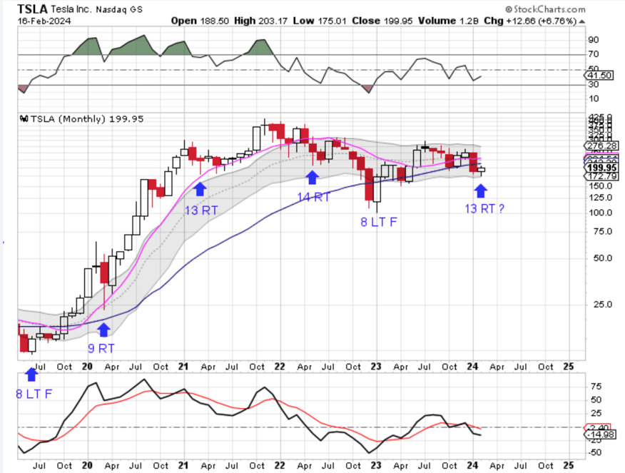 February is month 13, placing Tesla in its timing band for a YCL. Tesla is in the process of forming a bullish monthly reversal, which eases the parameters for forming a monthly swing low, A month swing low and close above the 10 month MA will signal the new yearly cycle.