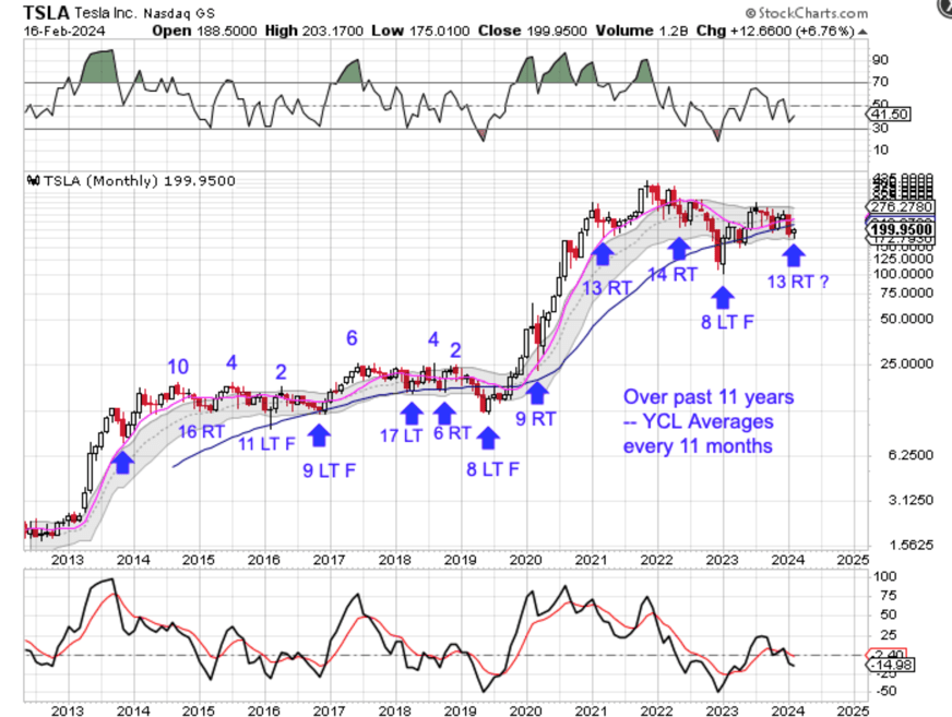 Over the past 11 years Tesla yearly cycle low formed, on average, every 11 months.