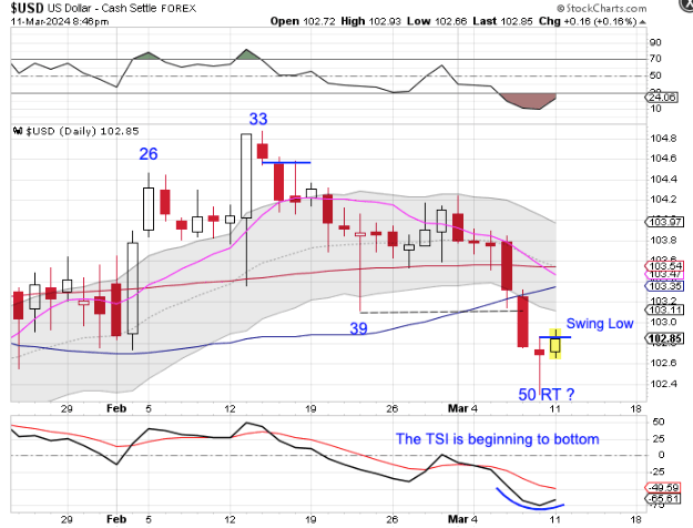 The dollar printed its lowest point on day 50. That places it very deep in its timing band for a DCL. Monday’s swing low signals the new daily cycle. We will use a close above the converging 10 day MA and 200 day MA to label day 50 as the DCL. The dollar is currently in a daily downtrend. The dollar will remain in its daily downtrend unless they close above the upper daily cycle band.