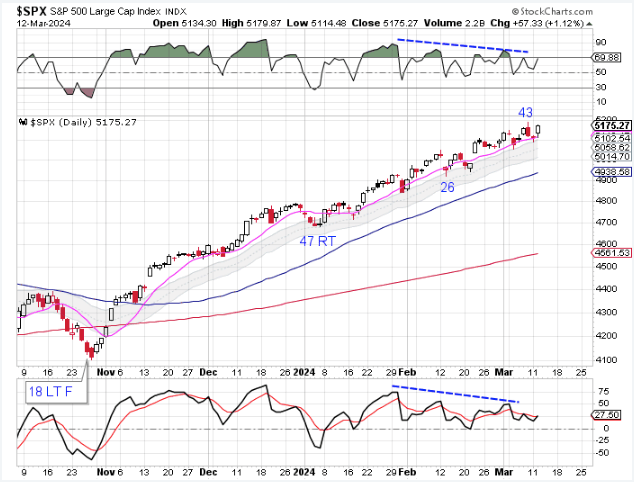 As we discussed here, stocks have not formed a recognizable DCL since late October. These runaway moves often end in a crash. Tuesday was day 45, placing stocks deep in their timing band for a DCL. While stocks are in a daily uptrend, there are bearish divergences developing on the oscillators. These bearish divergences usually precede a cycle decline. This could be a good time to rotate out of stocks into another area — like precious metals.