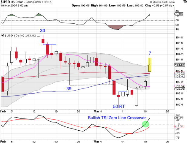 Breaking above these 2 important moving averages on its first try initially looked like a display of relative strength. If the dollar can manage to close above the upper daily cycle band that will end the daily downtrend and begin a new daily uptrend. However the dollar is in the process of forming a rejection candle. The dollar is currently in a daily downtrend. If the dollar forms a swing high below the upper daily cycle band and closes back below the converging 50 day MA and 200 day MA that will indicate a continuation of its daily downtrend and signal a cycle and sell signal. I plan to discuss the longer term intermediate and yearly cycle implications in the Weekend Report.