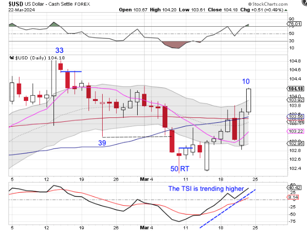 The dollar found support at the rising 10 day MA on Thursday and closed convincingly above the converging 50 day MA and 200 day MA to negate Wednesday’s bearish reversal. The dollar delivered bullish follow through on Friday, closing above the upper daily cycle band. Closing above the upper daily cycle band ends the daily downtrend and begins a daily uptrend.