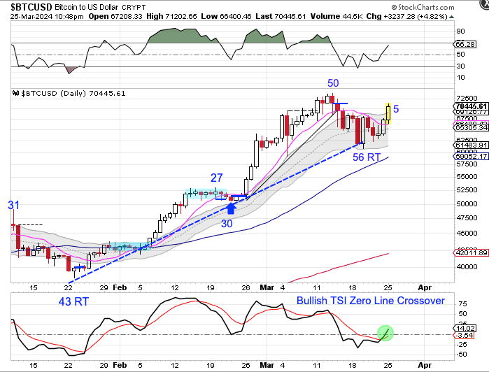 Bitcoin printed its lowest point on day 56, placing it deep in its timing band for a DCL. Bitcoin closed above the 10 day MA on Sunday then delivered bullish follow through on Monday. BTC is currently in a daily uptrend. Closing back above the 10 day MA indicates a continuation of its daily uptrend and signals a cycle band buy signal.