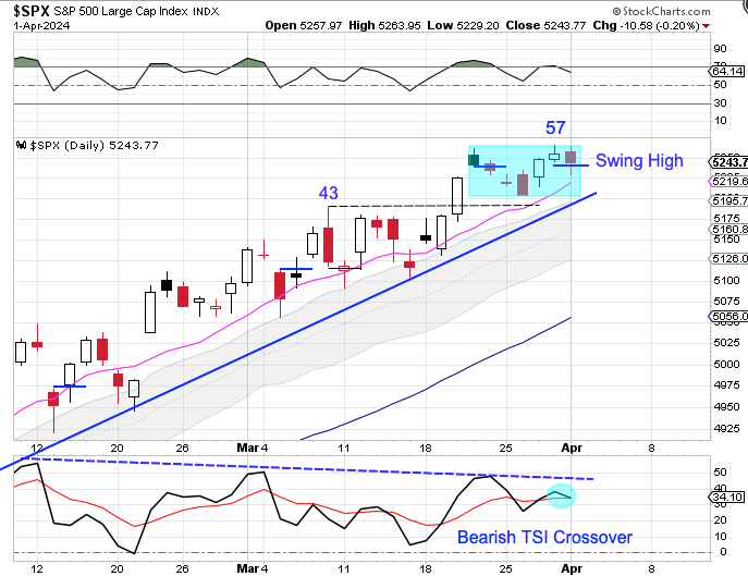 Monday was day 59, placing stocks very deep in their timing band for a DCL. Stocks appear to have begun a distribution phase. A close below the 10 day MA will signal the daily cycle decline. Stock should then go on to turn the 10 day MA lower in order to complete the daily cycle decline. Stocks are currently in a strong daily uptrend. They will remain in their daily uptrend unless they close below the lower daily cycle band.
