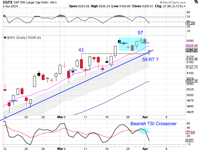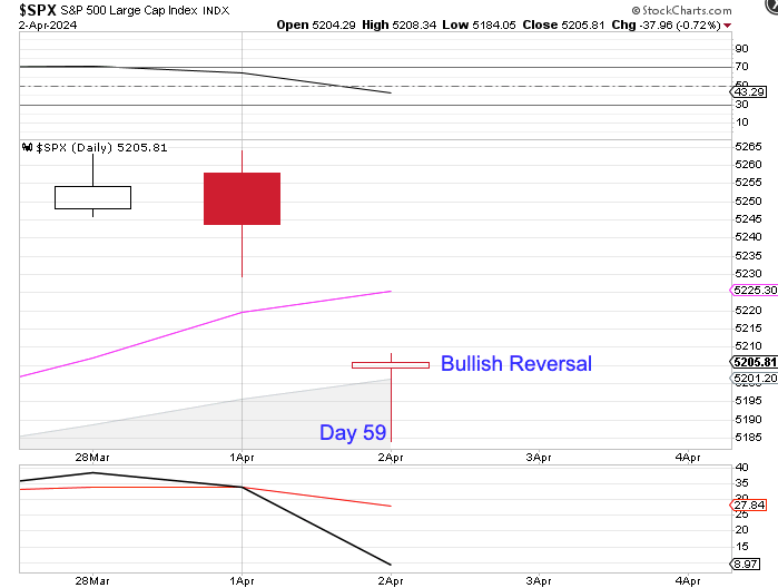 Tuesday was day 59, placing stocks deep in their timing band for a DCL. Tuesday’s bullish reversal eases the parameters for forming a swing low.