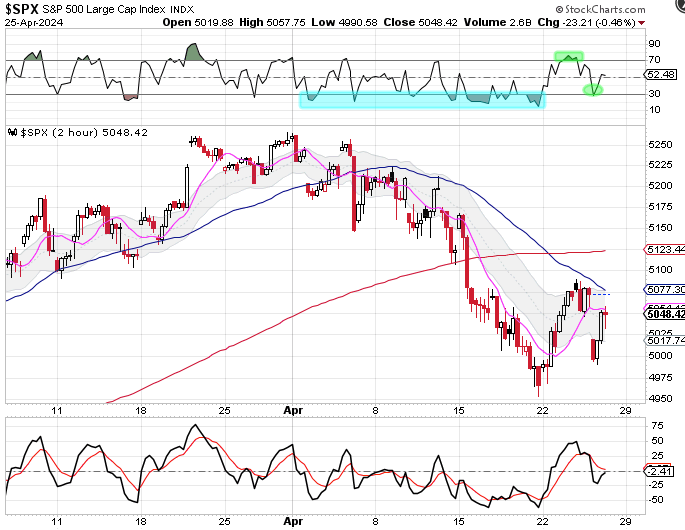 Even through stocks closed lower for the day there is a new pattern of a higher high and higher low emerging on RSI 05. The 2 hour chart showed that stocks ran into resistance at the declining 50 MA and gapped down lower on Thursday. Stocks managed to rally off the daily low to close near the high of the day. Also notice the change in behavior on the 2 hour RSI 05. Prior to Thursday, RSI 05 was characterized by highs below the 70 line and lows below the 30 line. That is beginning to change with a new high above the 70 line and a new low above the 30 line. The next signal that we are watching for is for stocks to close above the 50 MA on the 2 hour chart as further confirmation that day 72 was the DCL.