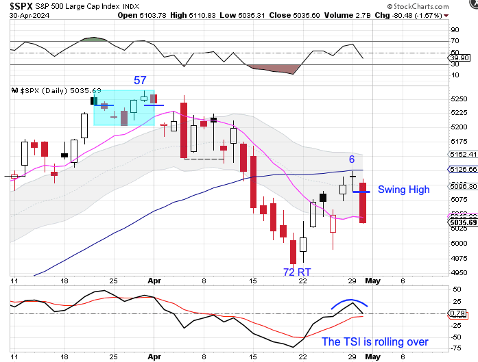 Stocks are currently in a daily downtrend. Forming a swing high below the upper daily cycle band and closing back below the 10 day MA indicates a continuation of its daily downtrend and signals a cycle band sell signal.