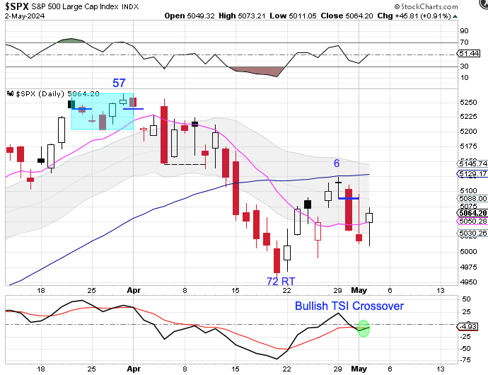 Stocks regained the 10 day MA on Thursday. Stocks should turn the 10 day MA higher as it rallies out of the recent DCL. Stocks are currently in a daily downtrend. But a close above the upper daily cycle band will end the daily downtrend and begin a new daily uptrend.