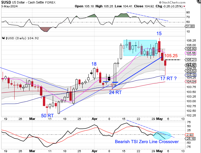 Friday was day 17 for the daily cycle, which is early to expect a DCL to form. However, the dollar found support from the rising 50 day MA and formed a bullish reversal — easing the parameters for forming a swing low. The dollar is currently in a daily uptrend. If the dollar forms a swing low above the lower daily cycle band and closes back above the 10 day MA, that will indicate a continuation of its daily uptrend and signal a cycle band buy signal — in which we would then label day 17 as an early DCL. A break above 105.25 will form a swing low.