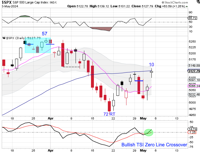 Stocks ran into resistance at the 50 day MA on Friday. A close above the 50 day MA will shift the odds that stocks are in a new intermediate cycle. Stocks are currently in a daily downtrend. A close above the upper daily cycle band will end the daily downtrend and begin a new daily uptrend.