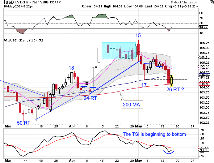 Thursday was day 26, placing the dollar in its timing band for a DCL. A swing low and close above the 50 day MA will signal the new daily cycle. We will use a close above the 10 day MA to label day 26 as the DCL. So, it is possible that we will see the dollar rally into a new daily cycle. In the Weekend Report I plan to discuss the longer term, Intermediate Cycle — here is a hint.