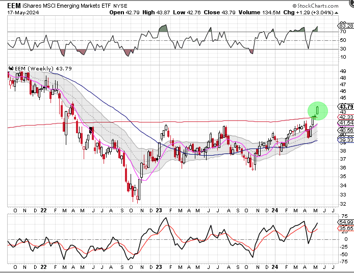 Taking a look at the EEM weekly chart we can see that EEM broke above the 200 week MA two weeks ago and delivered bullish follow through this week. EEM is currently in a weekly uptrend. Closing above the 200 week MA indicates a continuation of its weekly uptrend and signals a weekly cycle band buy signal.