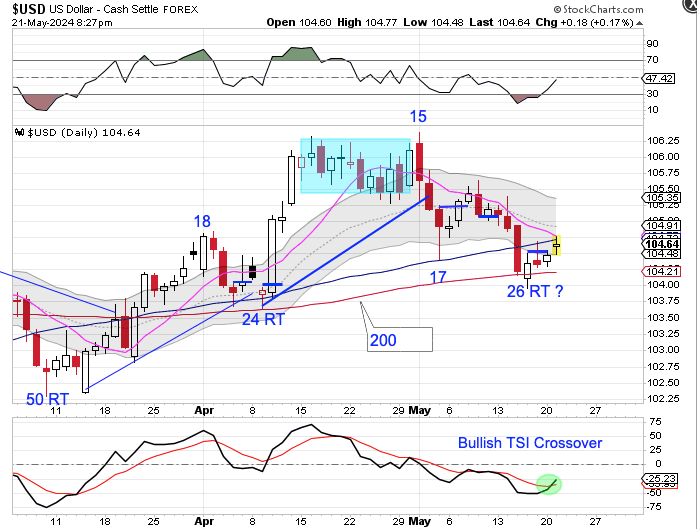 The dollar found support at the 200 day MA on Thursday and formed a swing low on Friday. Thursday was day 26, placing the dollar in its timing band for a DCL. A close above the converging 10 MA day and 50 day MA have us label day 26 as the DCL. The dollar is currently in a daily downtrend. The dollar will remain in its daily downtrend unless it closes above the upper daily cycle band.