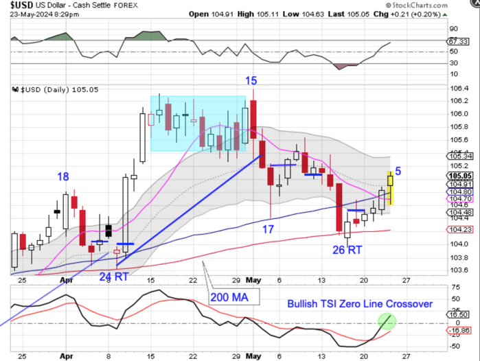 The dollar closed above the converging 10 day MA and 50 day MA on Wednesday to signal day 26 as the DCL. The dollar went on to deliver bullish follow through on Thursday. Notice that the 10 day MA had declined rather steeply as the dollar was hunting its DCL. The dollar will likely need to consolidate soon, in order to allow the 10 day MA to flatten out before it can turn higher. The dollar is currently in a daily downtrend. The dollar will remain in its daily downtrend unless it closes above the upper daily cycle band. In The Weekend Report I plan to breakdown my longer term view on the dollar which still remains