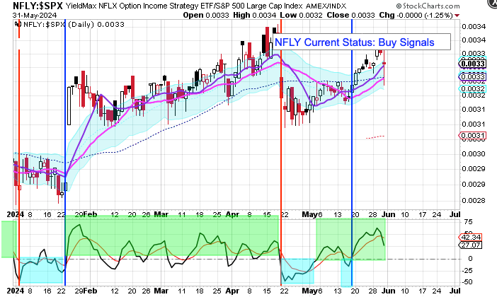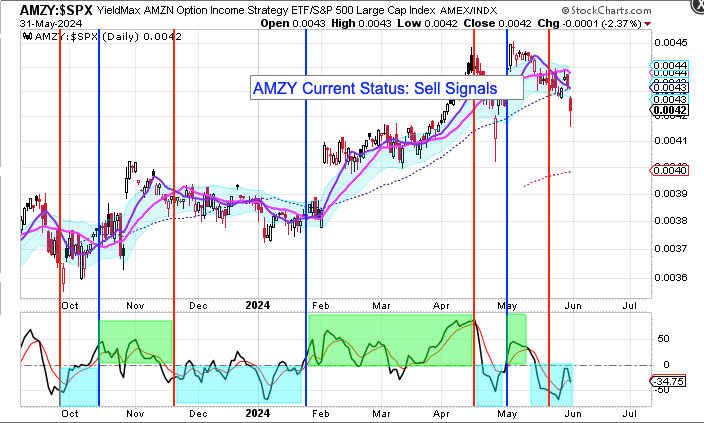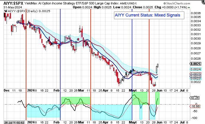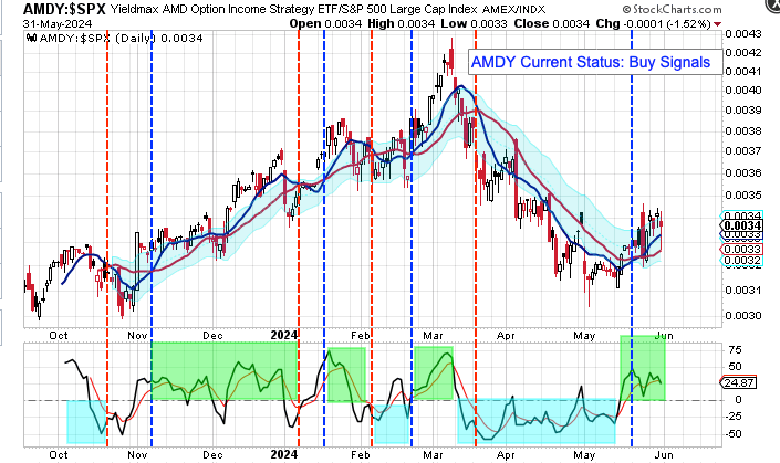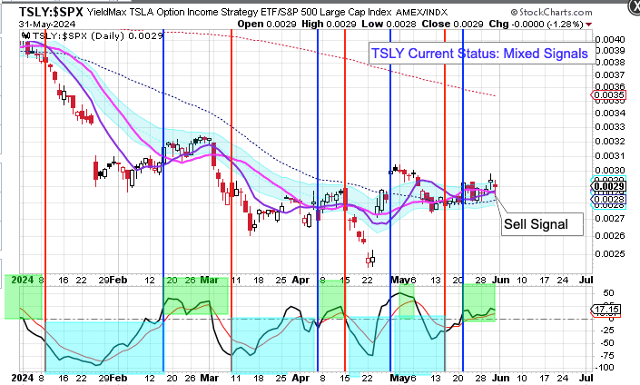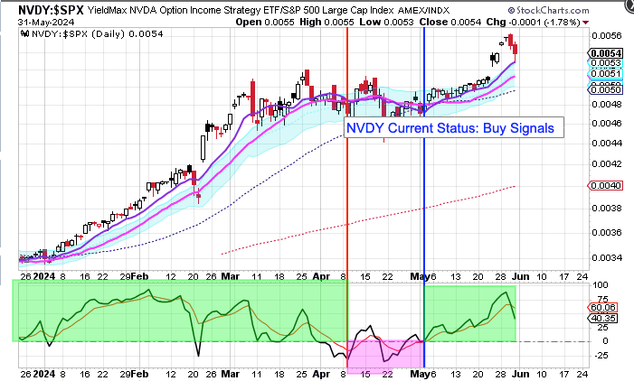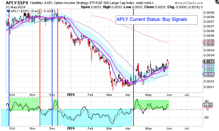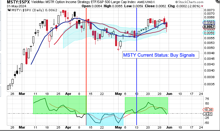 My YieldMax Rotation Strategy is to participate in the rallies and avoid the drawdowns. To do this I look at the different YieldMAX ETFs against the performance versus the SPY. Using a bullish/bearish crossover of the 10/20 MA’s as the buy/sell signal limits the downside drawdowns while participating in the capital appreciation.