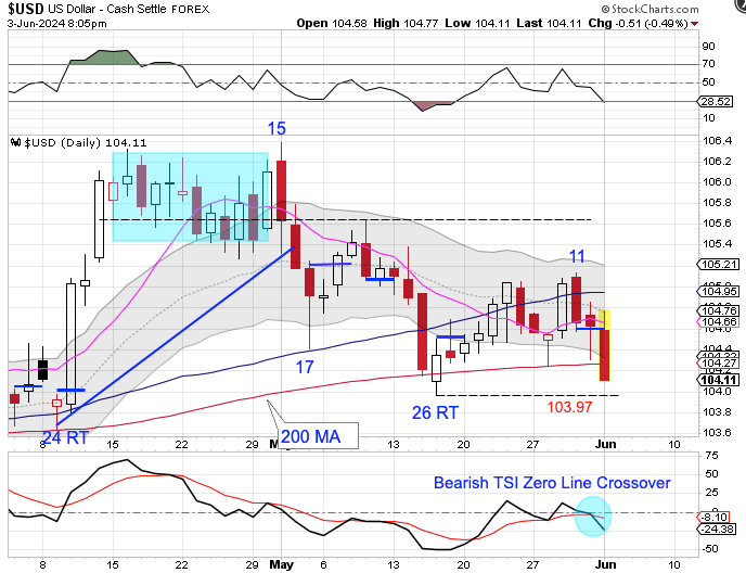 The dollar was rejected by the declining 10 day MA on Monday and is in the process of breaking convincingly below the 200 day MA. The dollar is currently in a daily downtrend. A close below the 200 day MA will indicate a continuation of its daily downtrend and signal a cycle band sell signal. A break below the previous DCL of 103.97 will form a failed daily cycle.