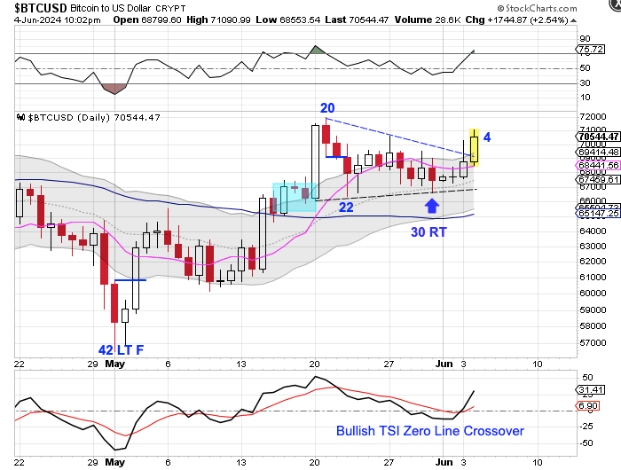 BTC is in the process of breaking out bullishly from its triangle consolidation on. Tuesday. Often the cycle low can migrate to the apex of the triangle during the consolidation. BTC is currently in a daily uptrend. Breaking bullishly out of the triangle consolidation indicates a continuation of its daily uptrend and signals a cycle band buy signal –so we will label day 30 as the DCL.