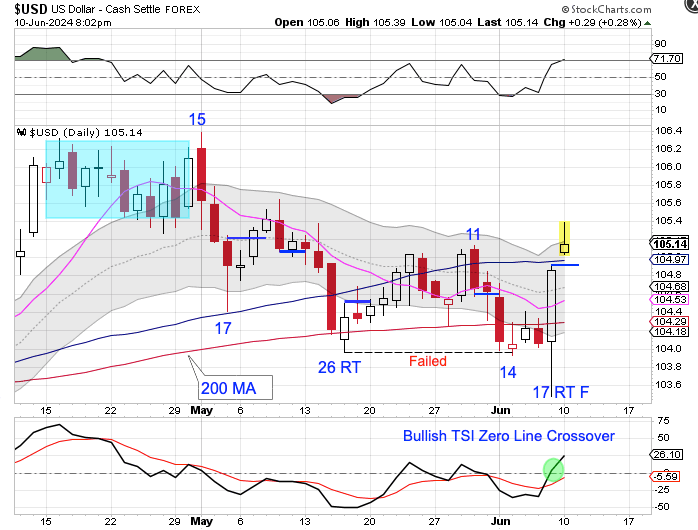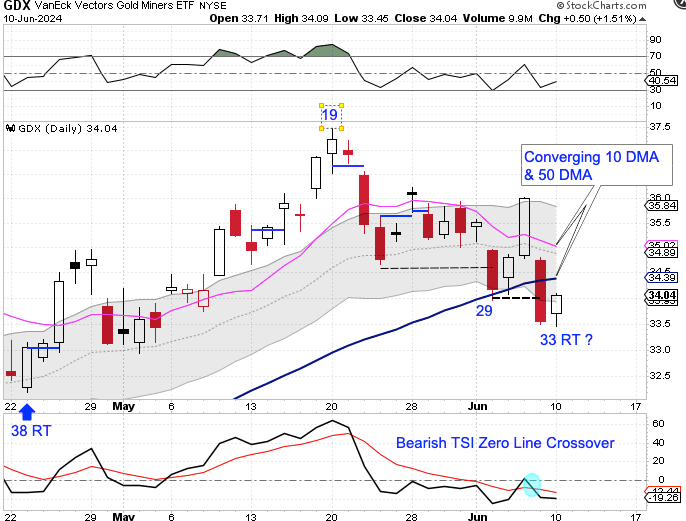 Monday was day 32, placing the Miners in their timing band for a DCL. A swing low and close above the converging 10 day MA and 50 day MA would have us label day 32 as the DCL. And why the reason why the Miners could close above the converging 10 day MA and 50 day MA could be the dollar.